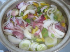 8月11日 畑の野菜のスープ。赤玉、 太いキュウリ、ゴーヤなどたっぷり。 ![]() |