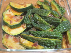 ゴーヤをフライパンで焼き、出汁に 入れる。縦に切ると苦みが少ない ![]() |