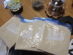 茹でた汁は保存。豆は手でジッパー に入れて麺棒でつぶしていきます。 ![]() |